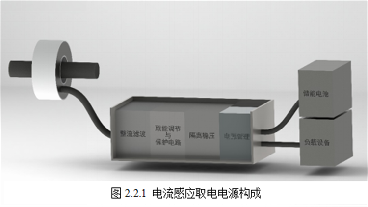 如图2.1.1,交流高压输电线周围的时变电磁能量,通过电磁感应效应,以“非接触”方式耦合进入取能线圈;取能线圈获取的电流经整流滤波电路、取能调节与保护电路、隔离稳压电路后,以稳定电流方式给储能电池充电;储能电池充当各类电子仪器仪表或电动操控设备等负载的稳定工作电源。整流滤波电路将取能线圈获得的交变电流转换为纹波系数较小的直流电流;取能调节与保护电路保证在高压电网电流剧烈波动,甚至出现短路的极端过载电流情形下,CTP可稳定工作或启动自动保护程序;隔离稳压电路保障在稳定状态下给出能电池充电,并与互感取能模块安全隔离。
